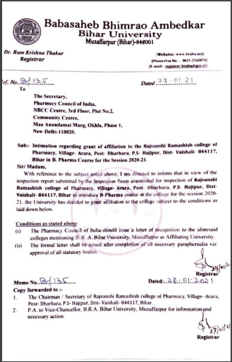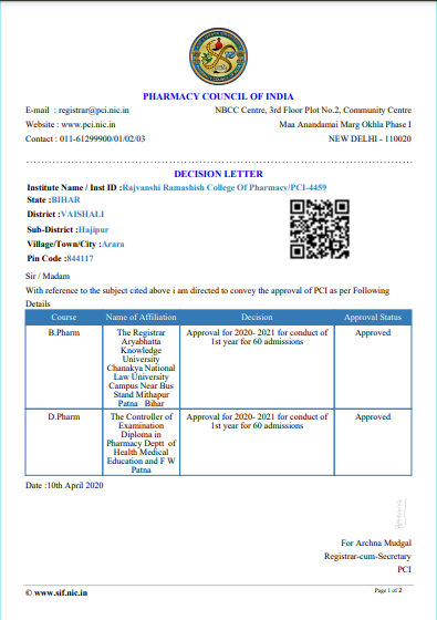 Rajvanshi Ramashish College of Pharmacy Academic Letter